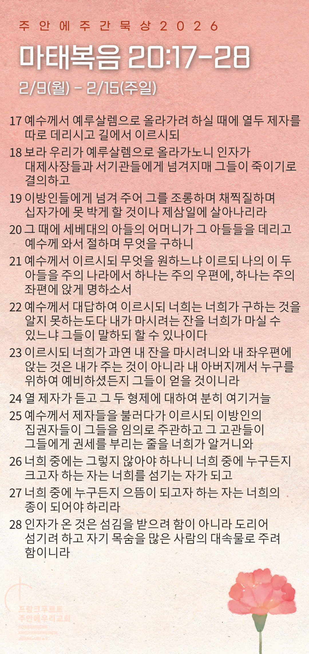 26 너희 중에는 그렇지 않아야 하나니 너희 중에 누구든지 크고자 하는 자는 너희를 섬기는 자가 되고