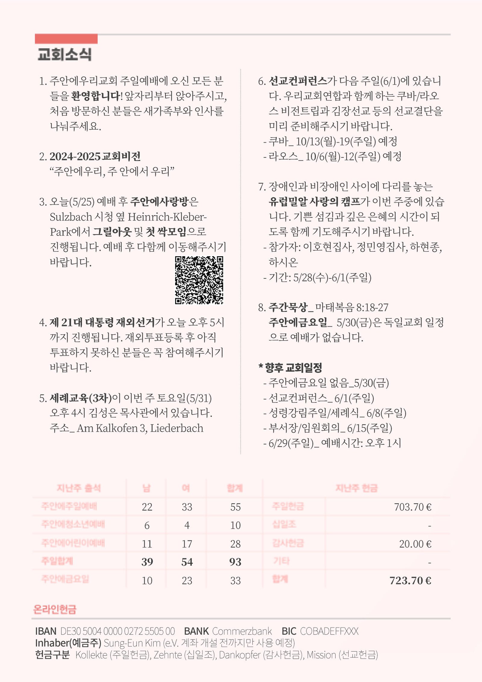 3. 오늘(5/25) 예배 후 주안에사랑방은 Sulzbach 시청 옆 Heinrich-Kleber-Park에서 그릴아웃 및 첫 싹모임으로 진행됩니다. 예배 후 다함께 이동해주시기 바랍니다.