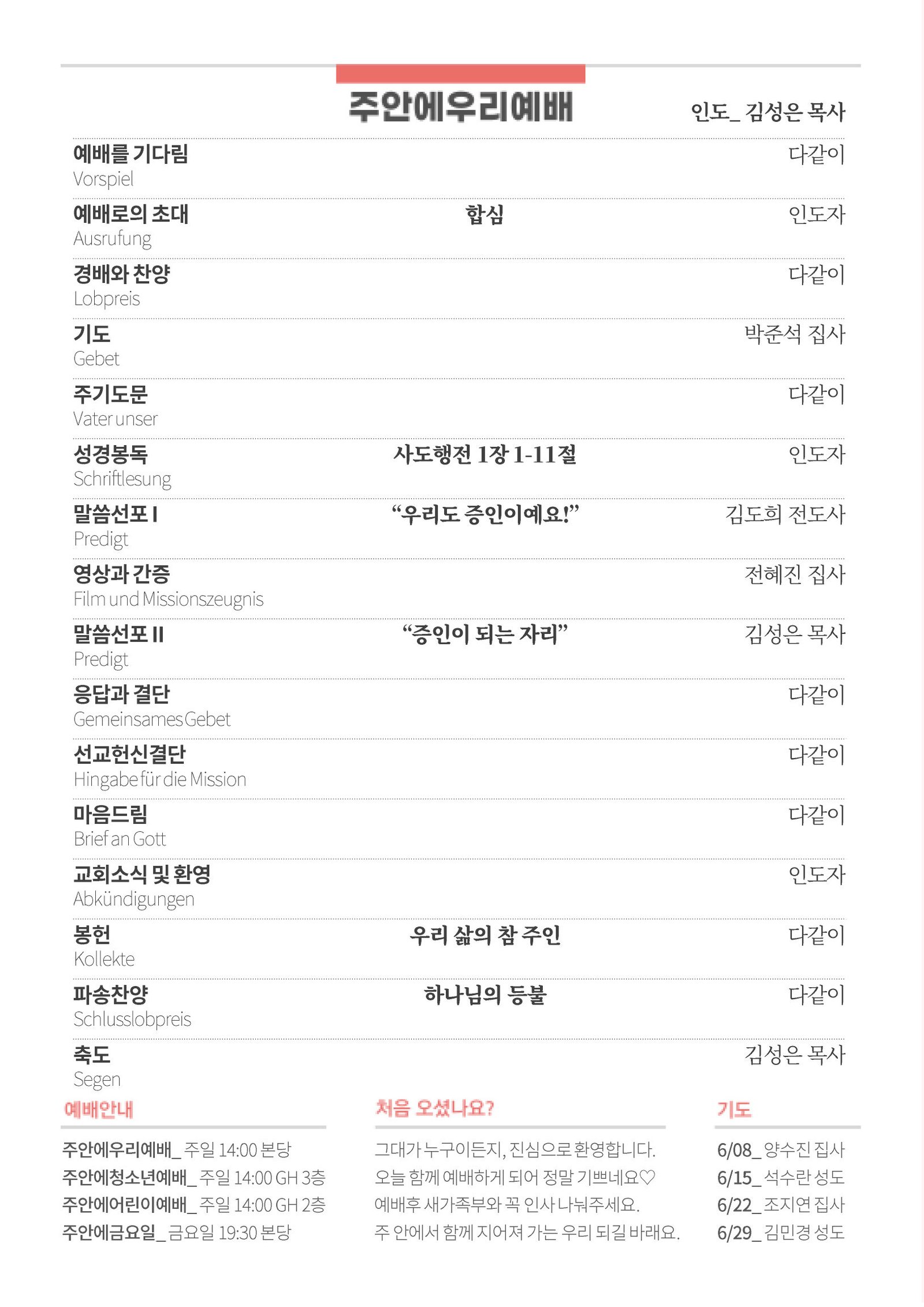 - 6/29(주일)_ 예배시간: 오후 1시
