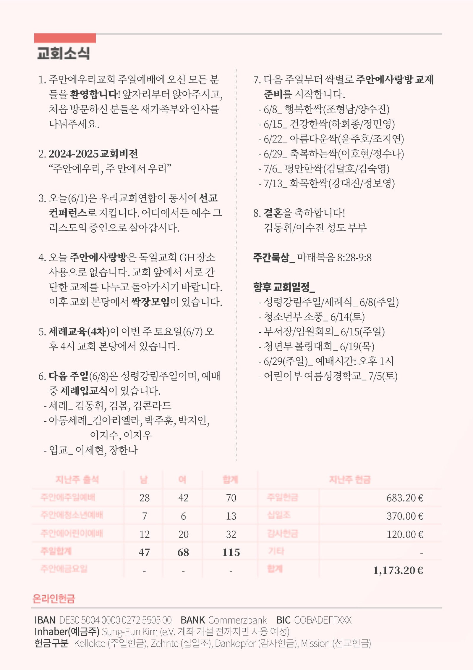 6. 다음 주일(6/8)은 성령강림주일이며, 예배 중 세례입교식이 있습니다. 어린이부, 청소년부와 함께 온가족예배로 드립니다.