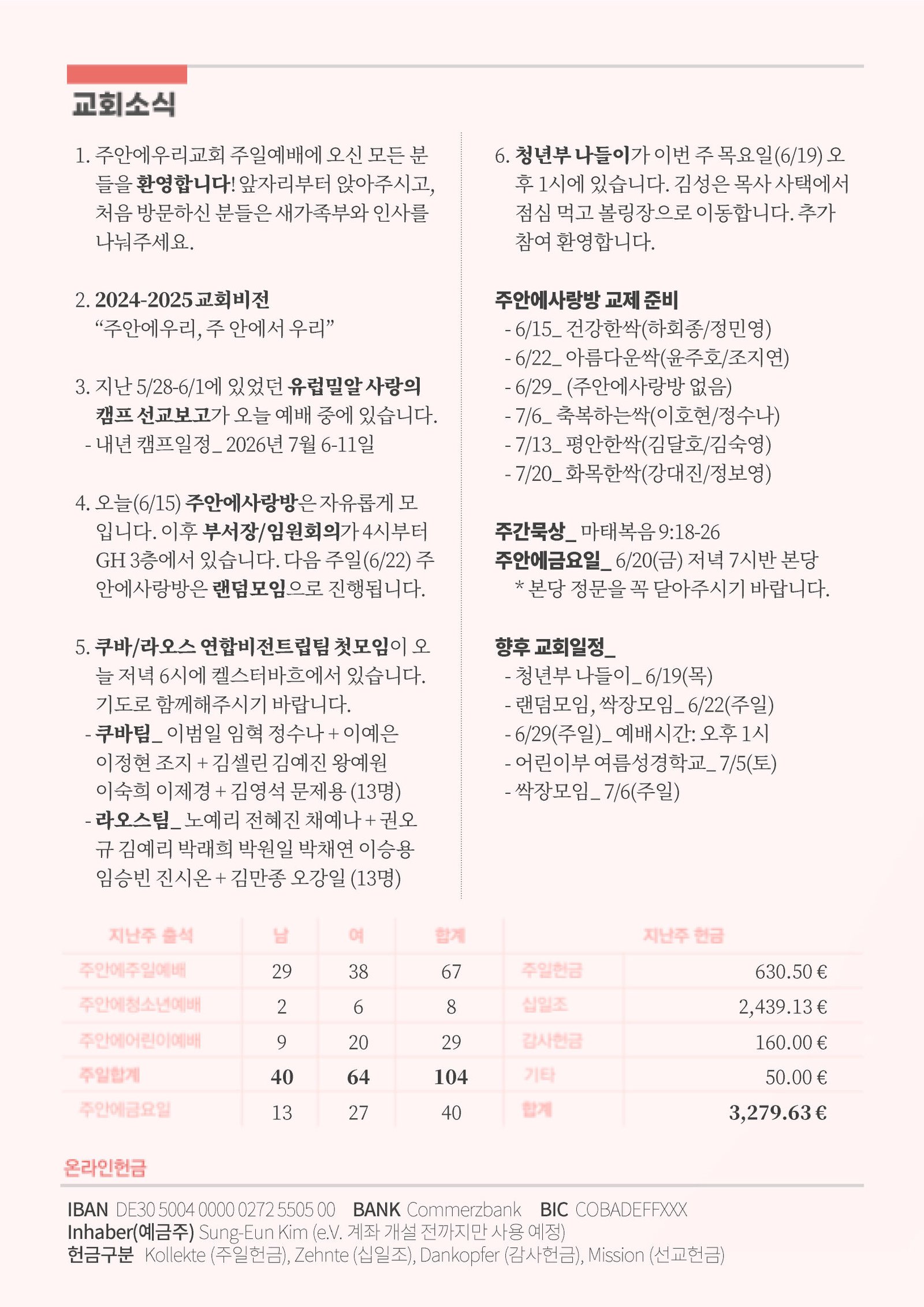 4. 오늘(6/15) 주안에사랑방은 자유롭게 모입니다. 이후 4시부터 GH 3층에서 부서장/임원회의가 있습니다. 다음 주일(6/22) 주안에사랑방은 랜덤모임으로 진행됩니다.