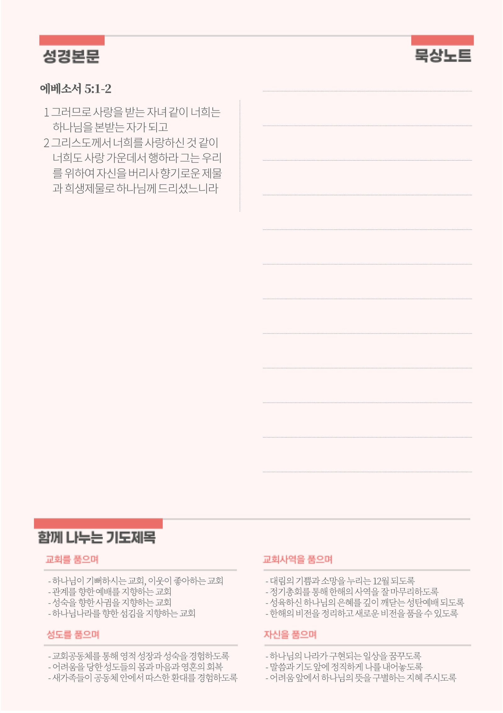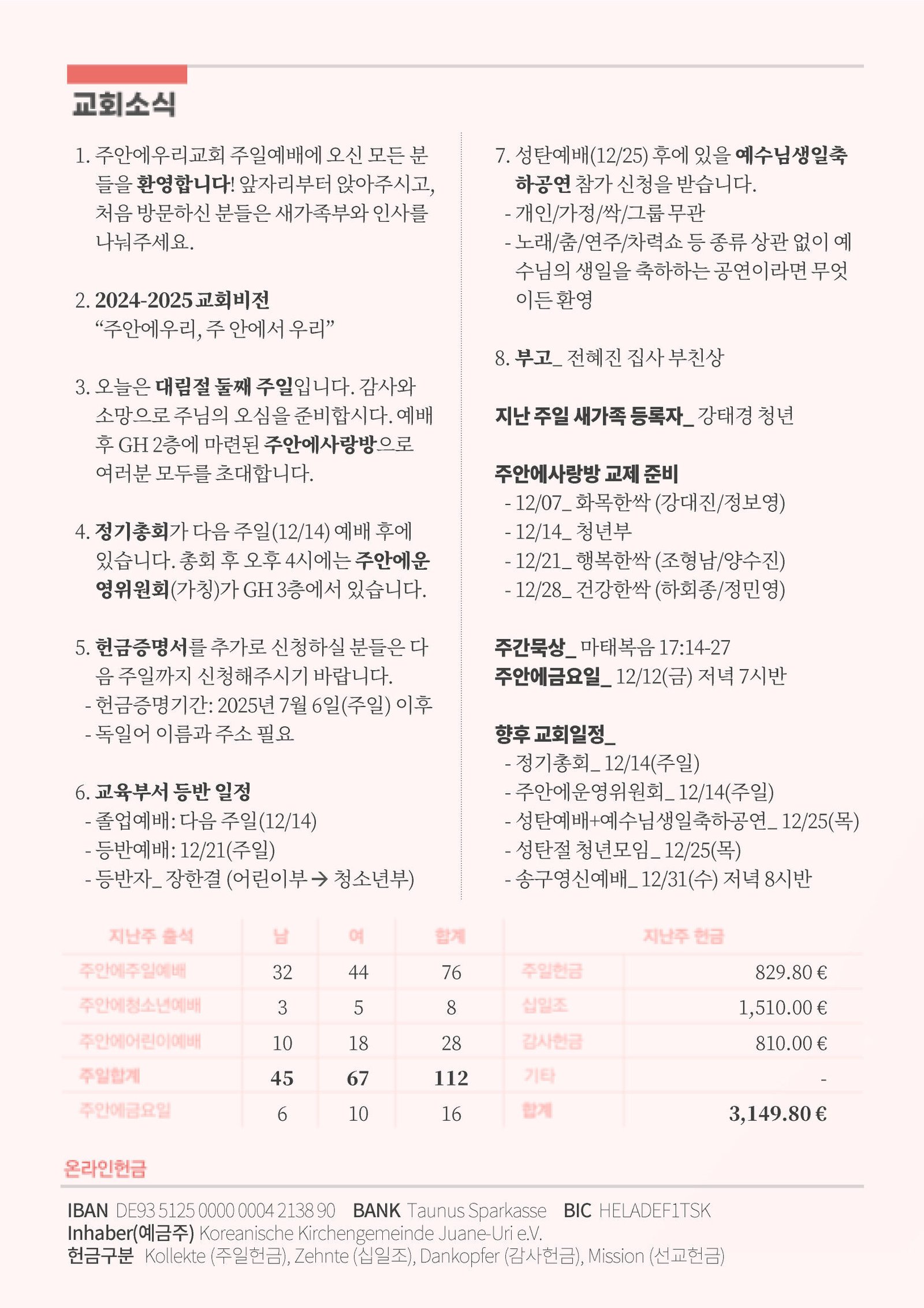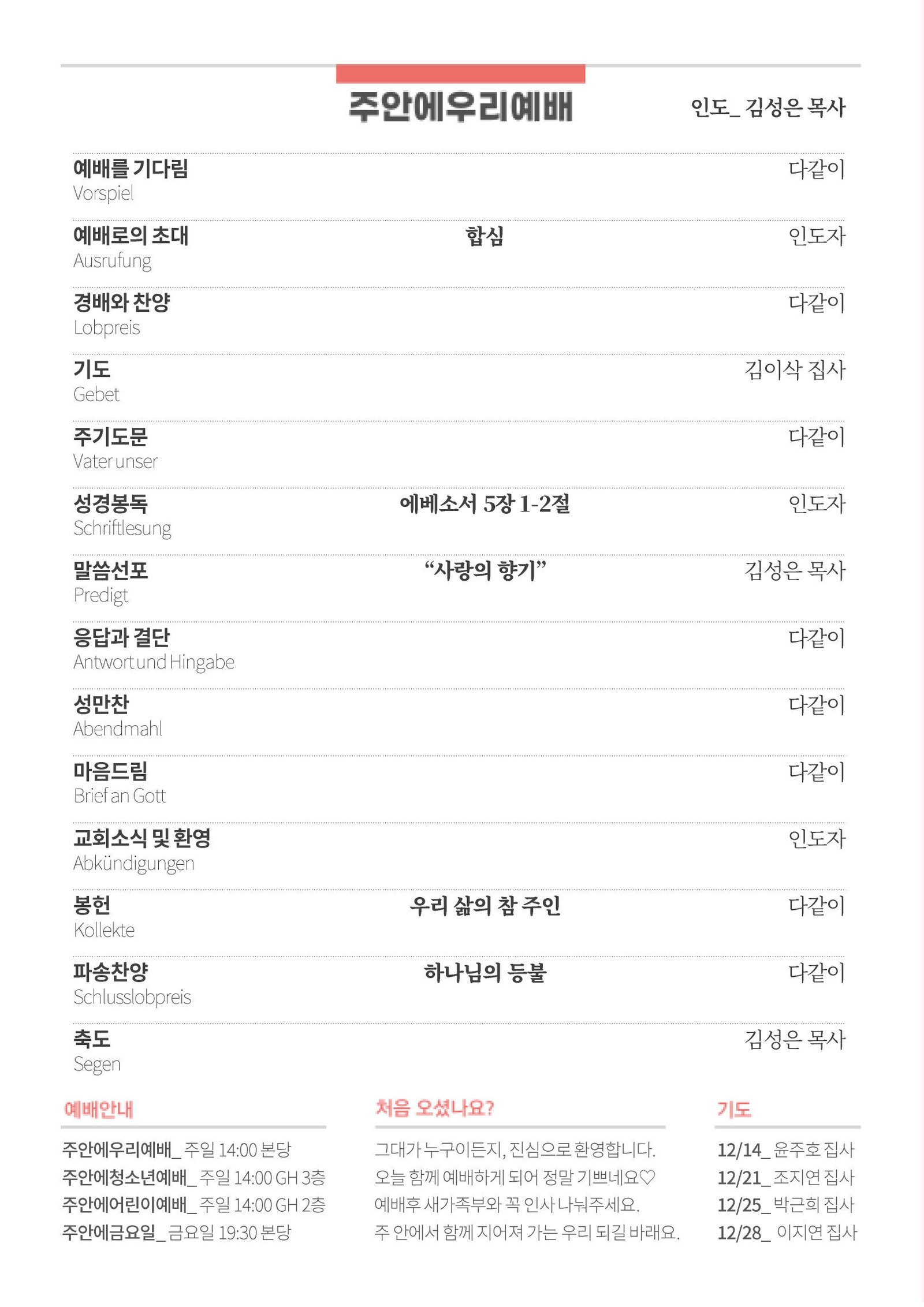 3. 오늘은 대림절 둘째 주일입니다. 감사와 소망으로 주님의 오심을 준비합시다. 예배 후 GH 2층에 마련된 주안에사랑방으로 여러분 모두를 초대합니다.