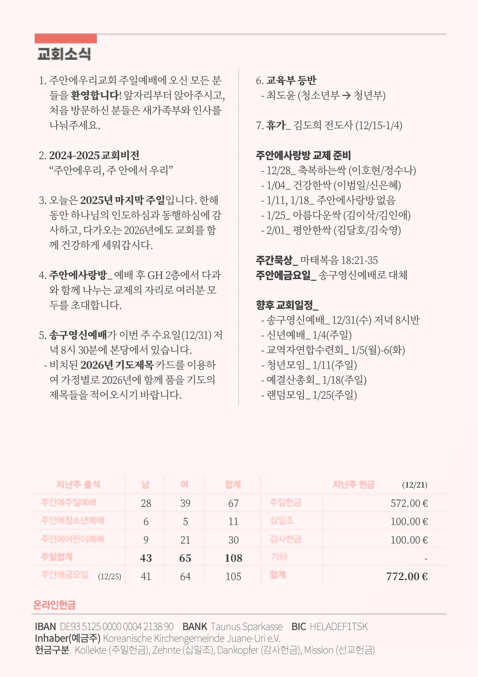 3. 오늘은 2025년 마지막 주일입니다. 한해동안 하나님의 인도하심과 동행하심에 감사하고, 다가오는 2026년에도 교회를 함께 건강하게 세워갑시다.
