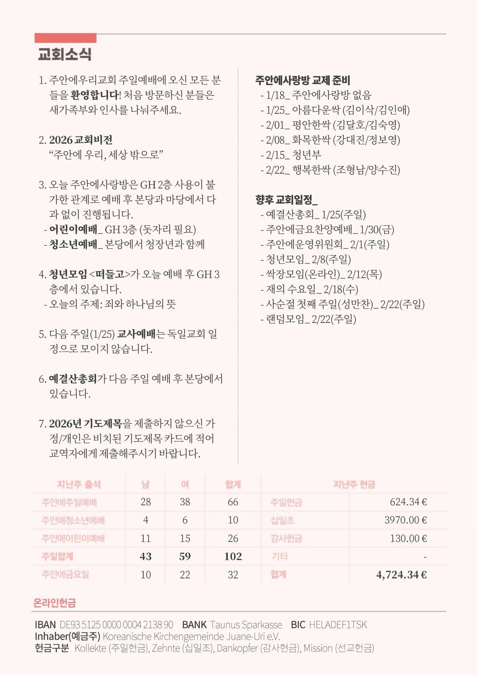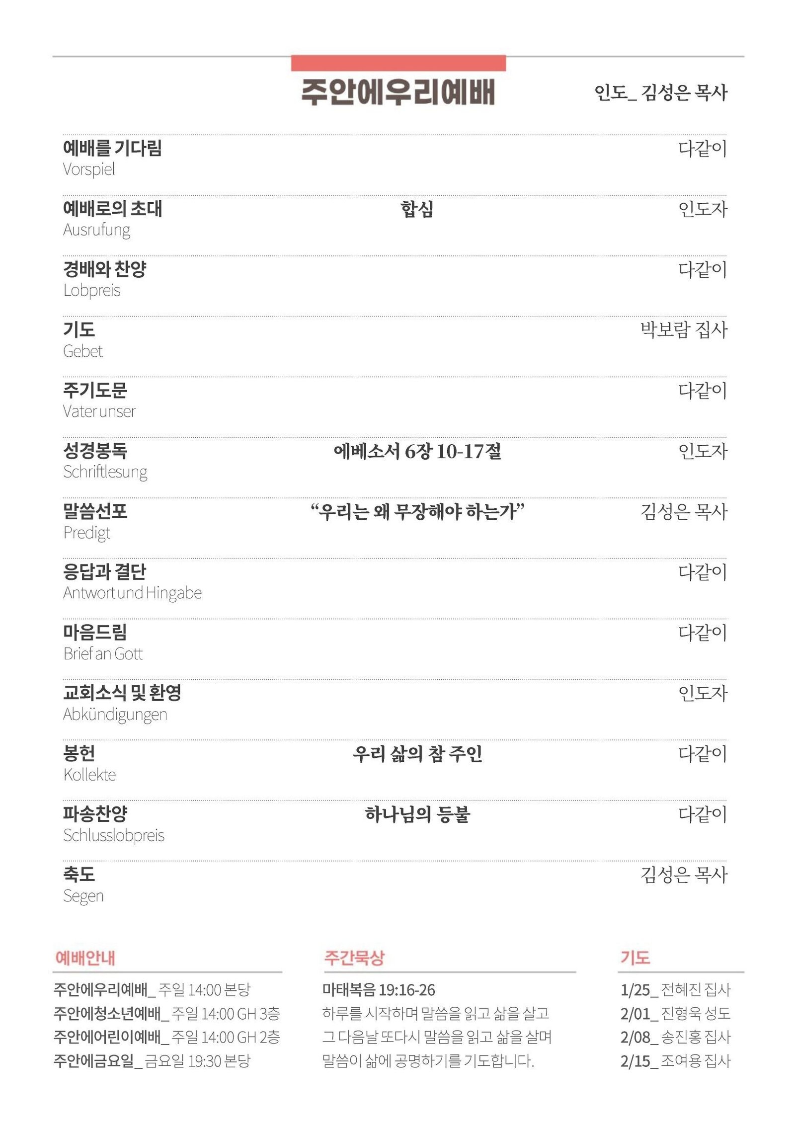 5. 다음 주일(1/25) 교사예배는 독일교회 일정으로 모이지 않습니다.