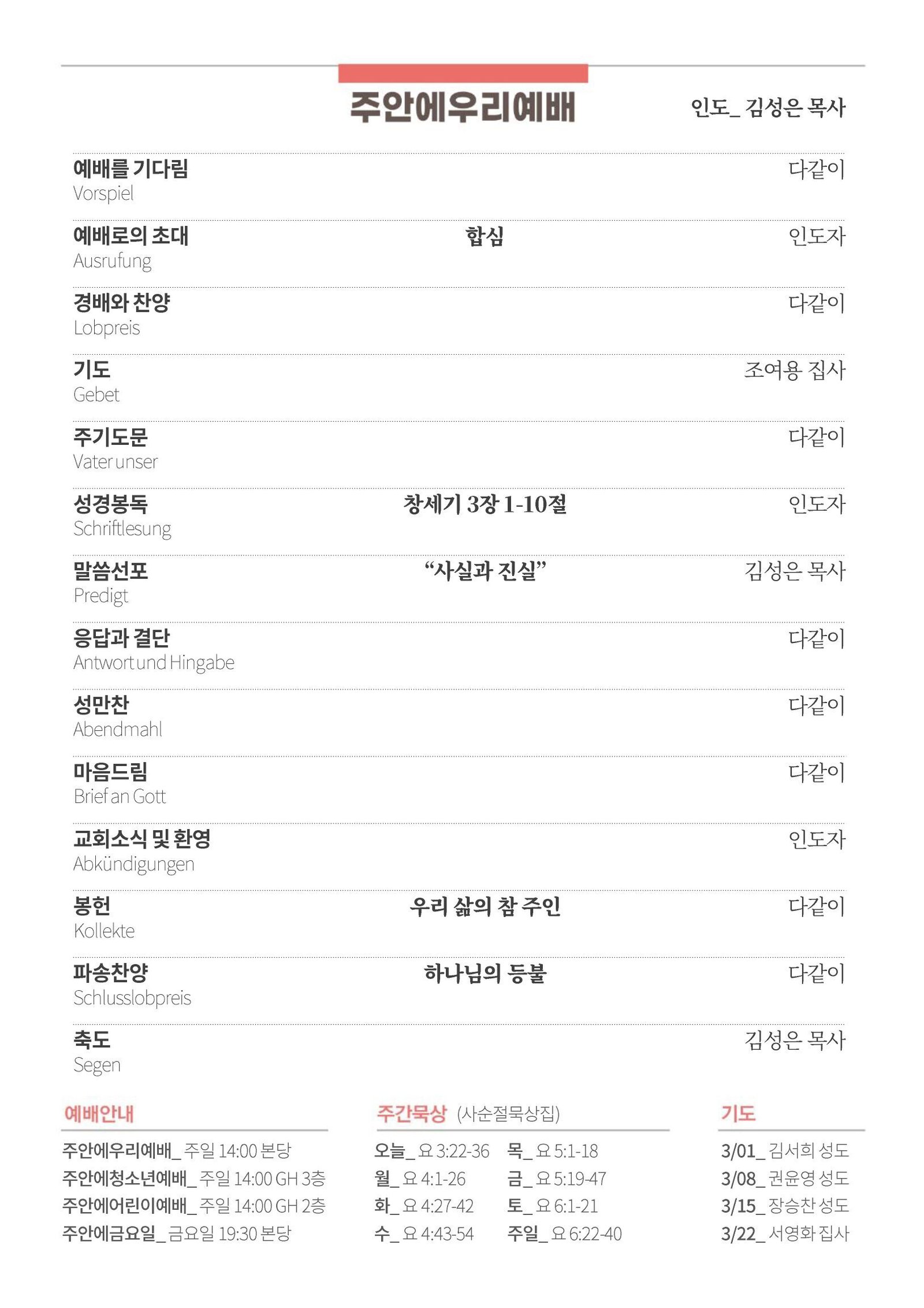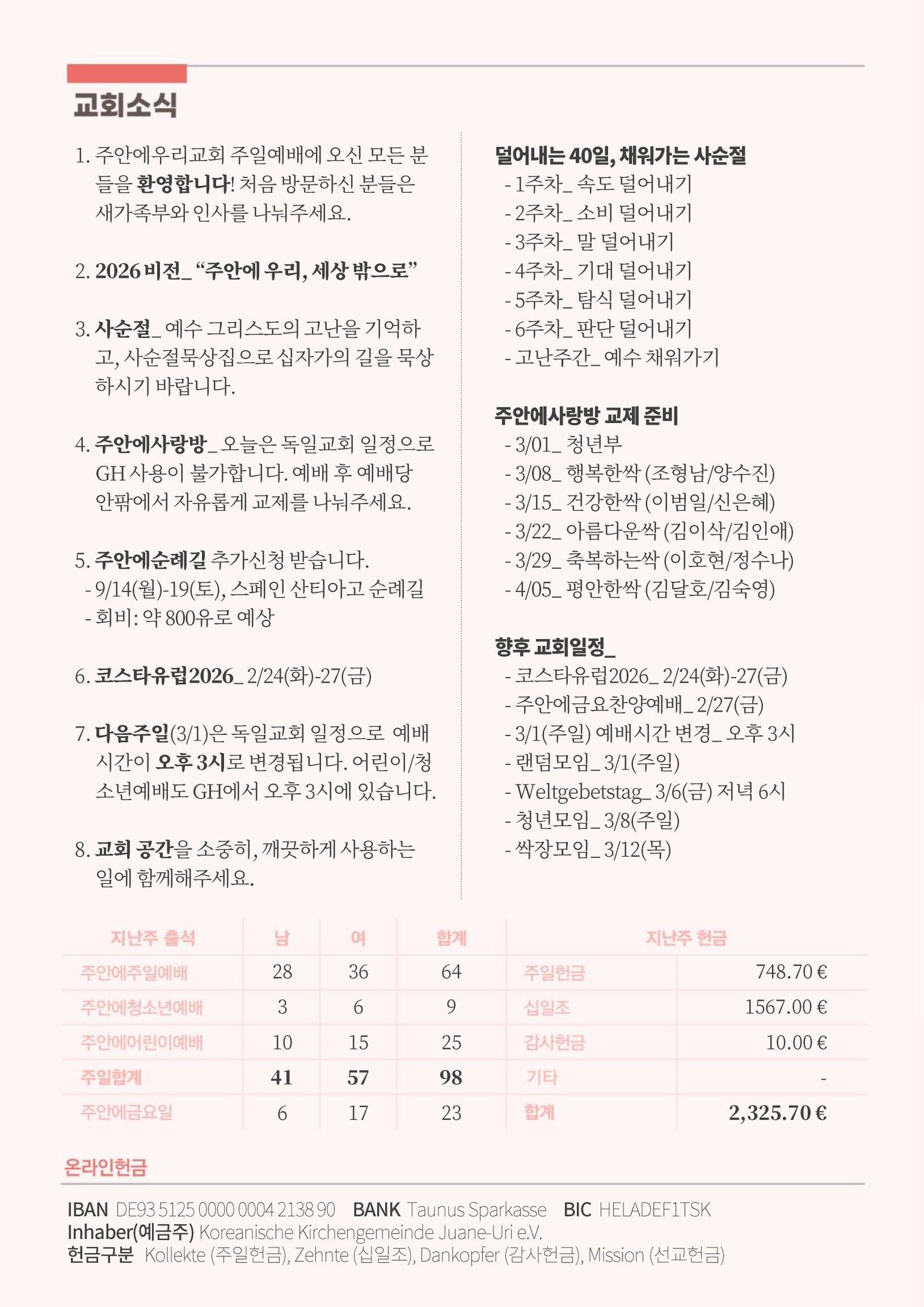 7. 다음주일(3/1)은 독일교회 일정으로 예배시간이 오후 3시로 변경됩니다. 어린이/청소년예배도 GH에서 오후 3시에 있습니다.