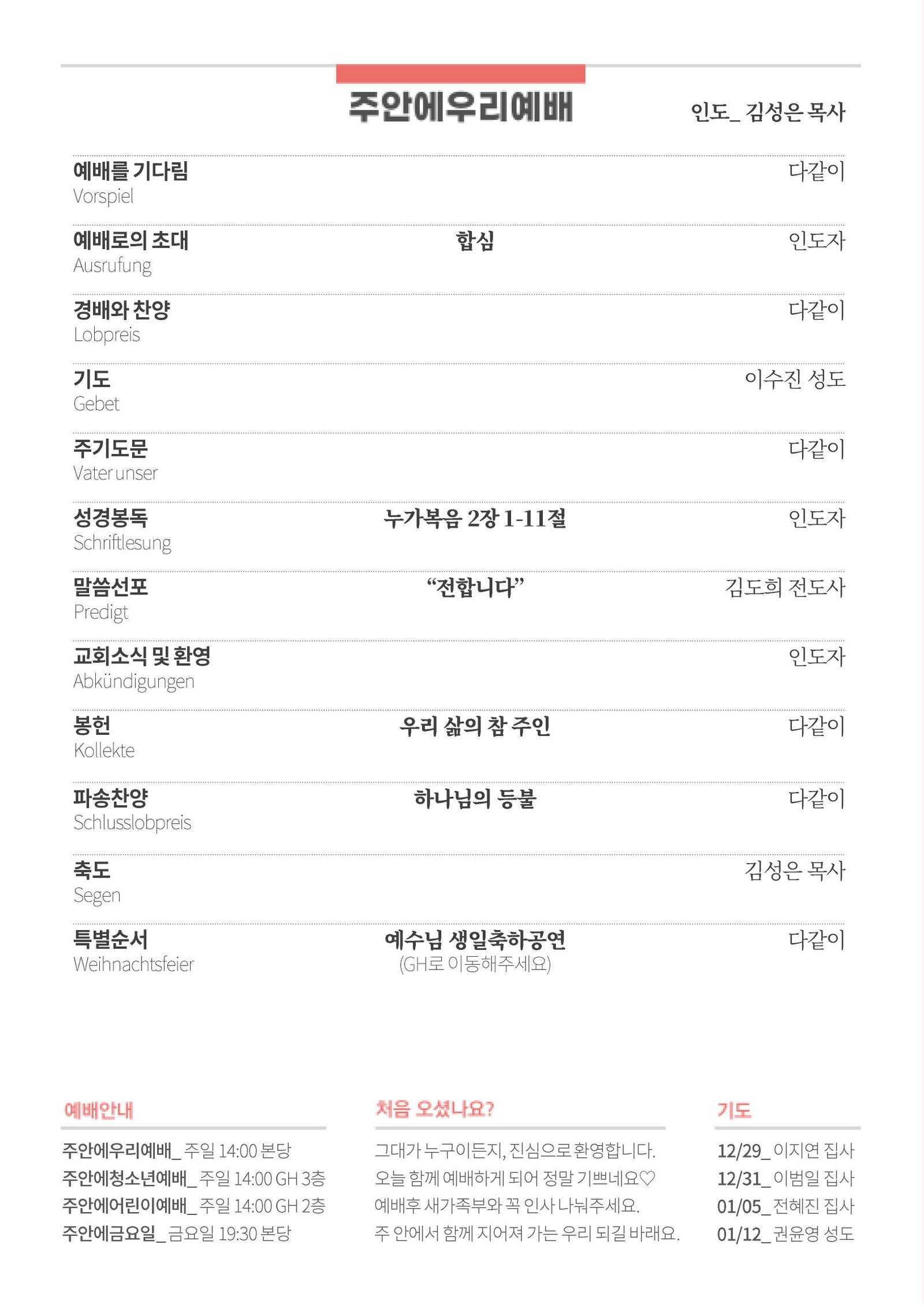 3. 오늘(12/25)은 성탄절입니다. 우리와 함께 하시기 위해 이 땅에 오신 아기 예수님께 기쁨과 감사로 예배합시다.