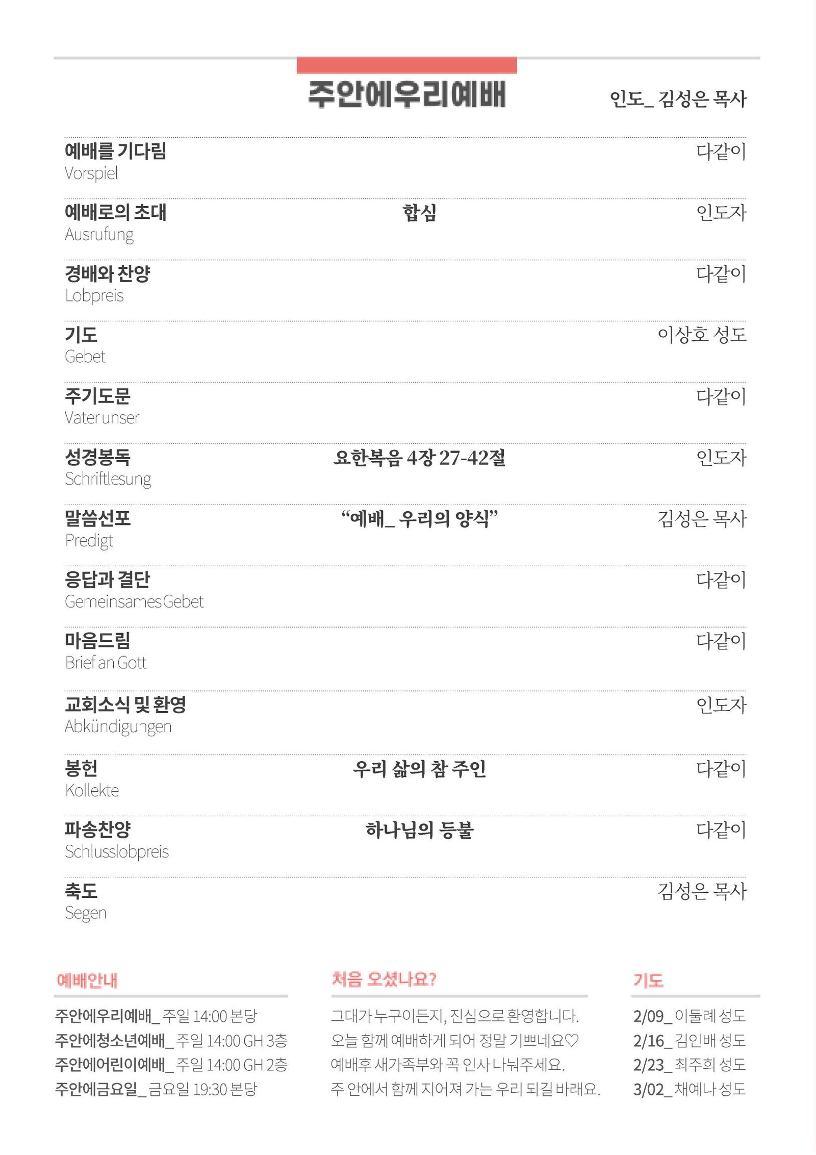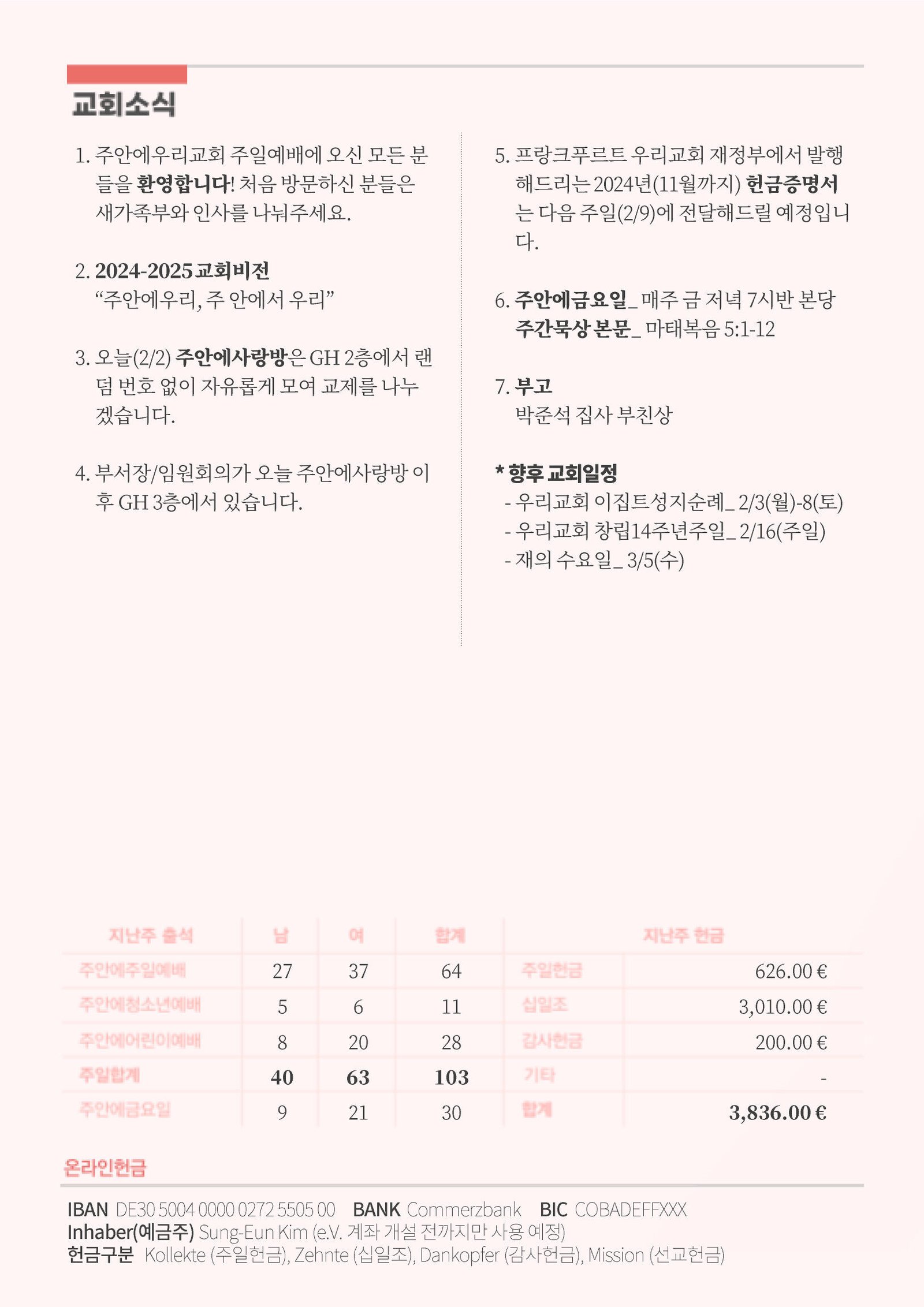 5. 프랑크푸르트 우리교회 재정부에서 발급하는 2024년 11월까지의 헌금증명서는 다음 주일(2/9)에 전달해드릴 예정입니다.