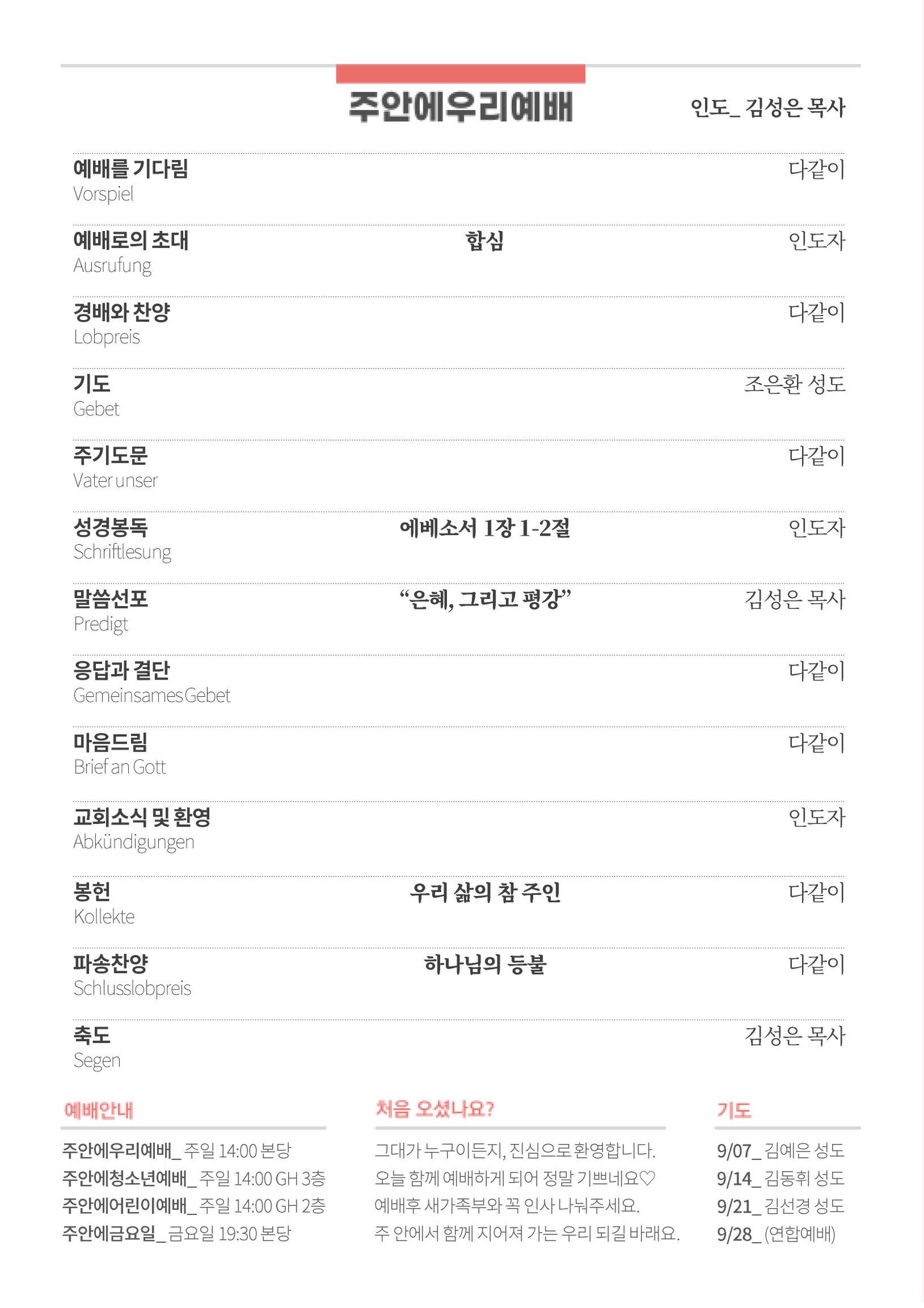 2. 오늘은 독일교회 일정으로 주안에사랑방이 없습니다. 예배 후 교회 앞에서 교제를 나누시다가 11:45분까지 교회를 비워주시기 바랍니다. 다음 주일(9/7) 예배는 원래대로 오후 2시에 있습니다.