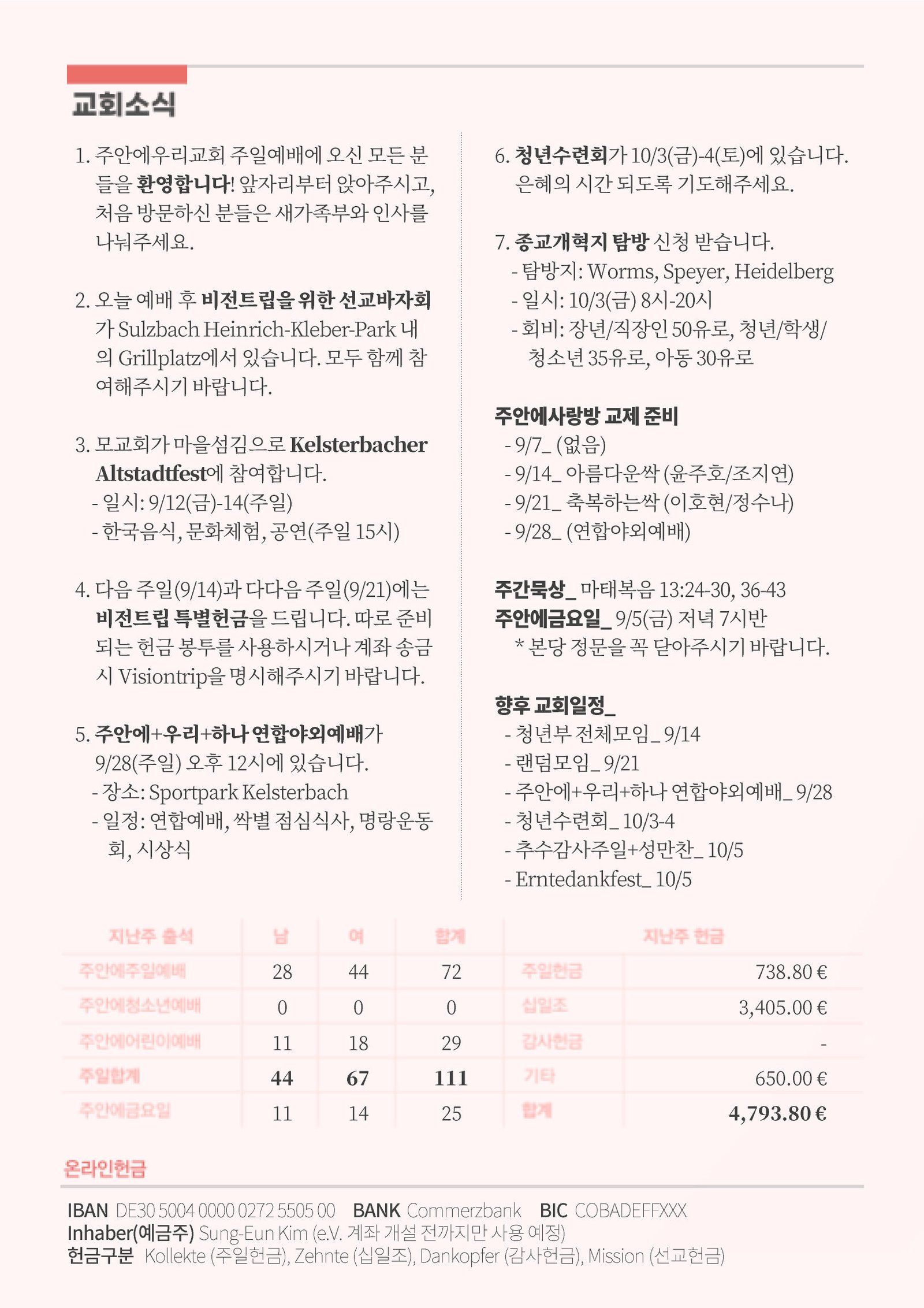 4. 다음 주일(9/14)과 다다음 주일(9/21)에는 비전트립 특별헌금을 드립니다. 따로 준비되는 헌금 봉투를 사용하시거나 계좌 송금 시 Visiontrip을 명시해주시기 바랍니다.